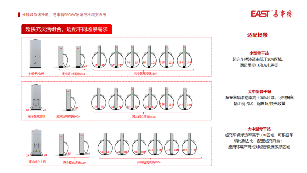 灵活部署:超高功率主机配置,1拖16把枪灵活选择,可实现充电站快速建站及规模化部署;超充终端紧凑机身灵活布局,老旧场站改造利用率提升50%。